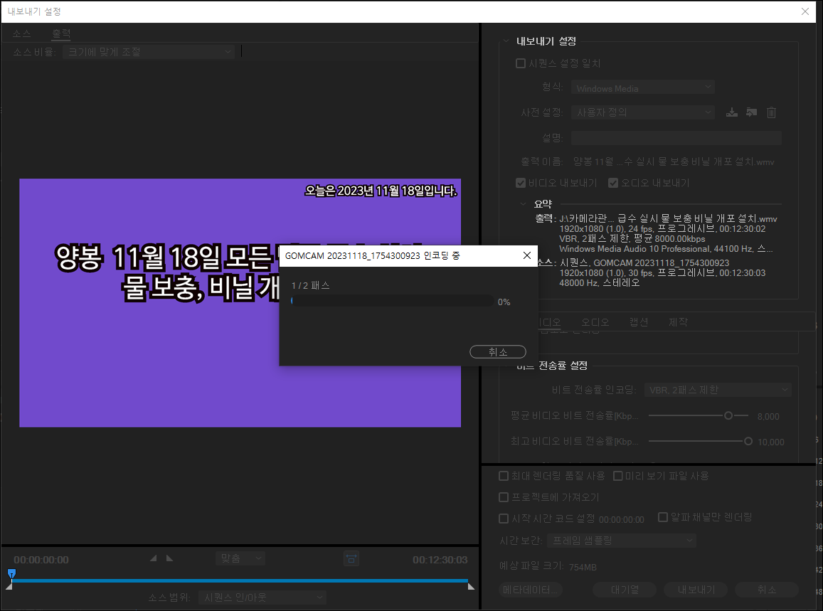 위의 마우스가 가리키는 곳을 클릭하고 패스, 즉, 저장할 경로를 지정하고 파일 이름을 지정하고 [내 보내기]를 클릭하면 짜잔, 다음과 같이 순조롭게 렌더링이 진행됩니다.