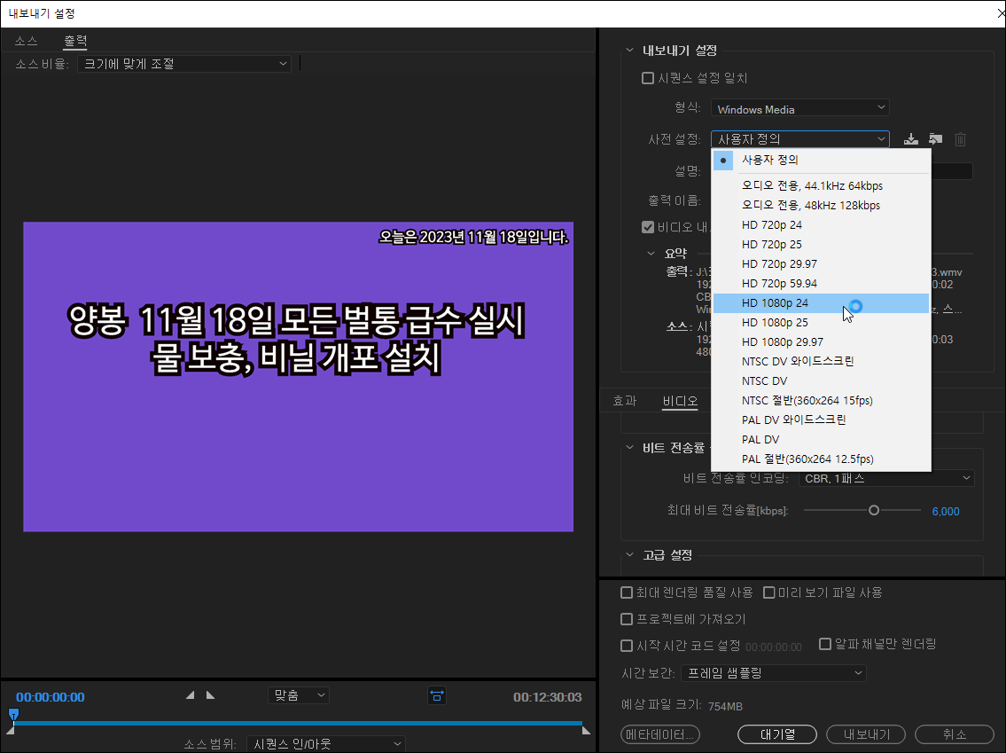 위의 마우스가 가리키는 곳을 보면 1080p라고 나온 중에서 24, 25, 29.97이 있는데요, 이는 초당 보여줄 프레임이고요, 필자는 대부분 24(프레임)를 선택합니다.
